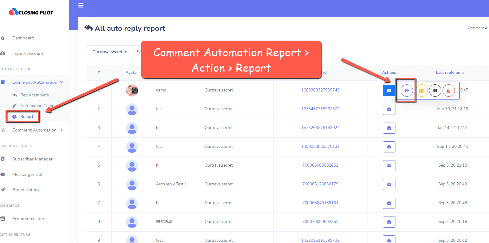 Comment Automation > Auto Reply/Full Page Campaign > Action > Report